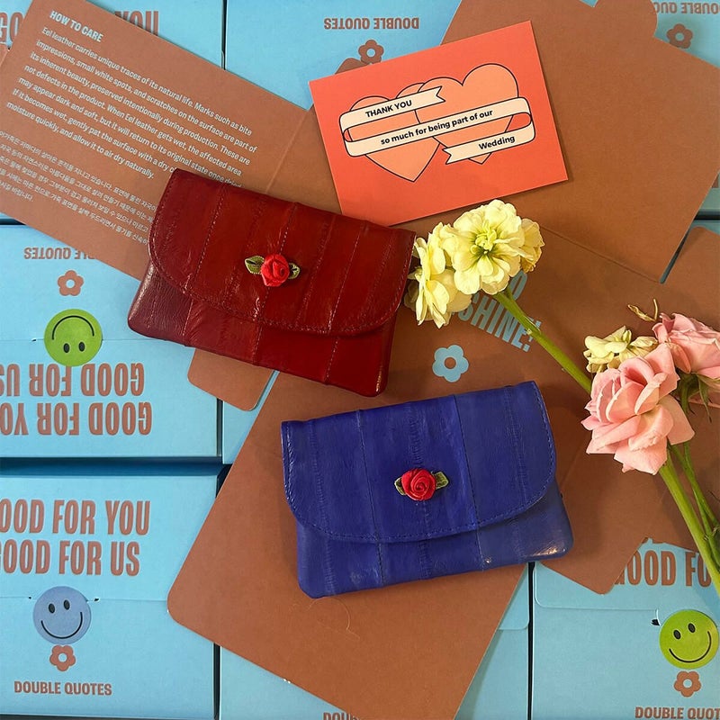手仕事で一つひとつ咲かせたバラがアクセントになった、優しい雰囲気のカードホルダー「ローズ」。軽やかでしなやかなレザーを使用し、見た目以上の収納力を実現。内側の裏地には、繊細なフラワーパターンをあしらい、さりげないラブリーさをプラスしました。日々の中で、あなたの人生がふわりと花咲きますように。 ウナギ革のことをイールスキンと言います。一般的に流通している牛革や羊革と比べると、加工の難しさから主に高級品に使用されてきたため、馴染みがないと感じる方もいるかもしれません。この革は非常に柔らかな質感で、触り心地がとても心地いいのが特徴です。さらに、とても強い繊維構造でキズや摩耗に強く、牛革の約1.5倍の耐久性があります。長期間にわたって使用をしても、丈夫で美しさが持続します。韓国の食品産業の副産物として活用されるイールスキンは、ウナギの皮をリサイクルして作られるため、環境に優しい素材として注目を集めています。無駄を少なくするサスティナブルな選択肢です。イールスキンは他のレザーと異なり、1枚1枚が個性的な模様を持っているため、全く同じものが存在しません。それにより一点物の特別なアイテムとなります。“ダブルクォーツ”はイールスキンのこうしたユニークな特性を生かし、鮮やかな色彩、軽い手触り、多様な用途に重点を置き、独創的で個性的なデザインを重視するブランドを追求しています。