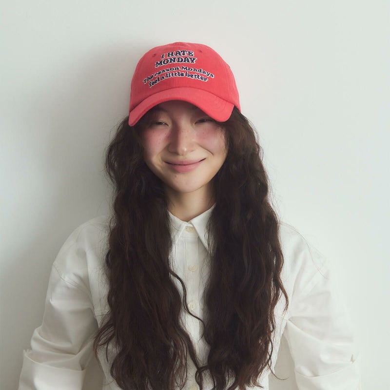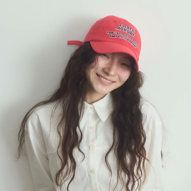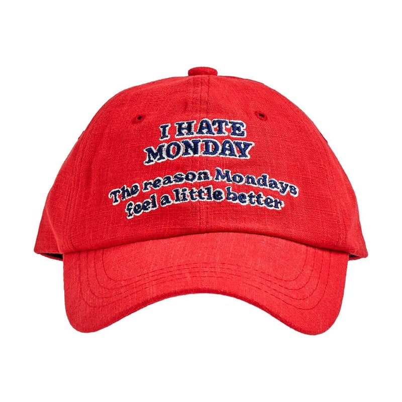 「I HATE MONODAY」の刺繍が入ったボールキャップ。このキャップをかぶれば、少しだけ月曜日が楽しくなるかもしれません。柔らかなフィット感とリアストラップで、どなたでも楽しく自然に着用いただけます。
