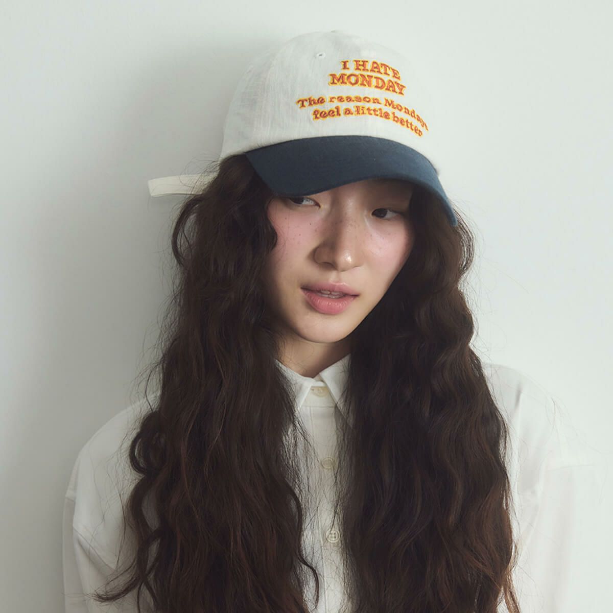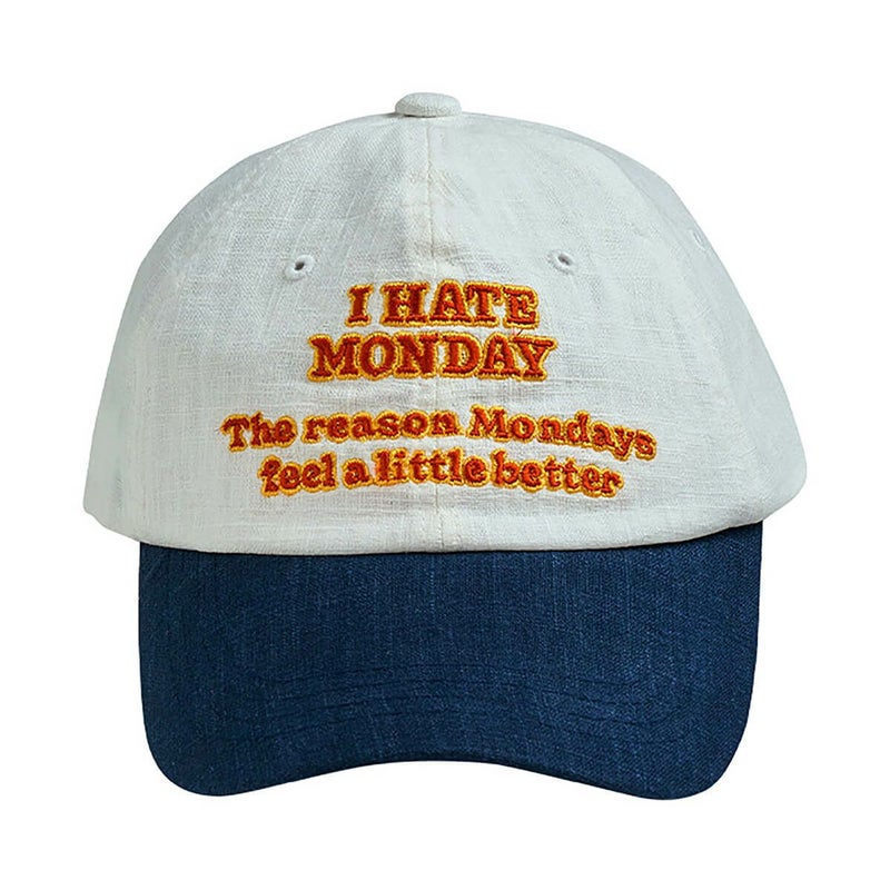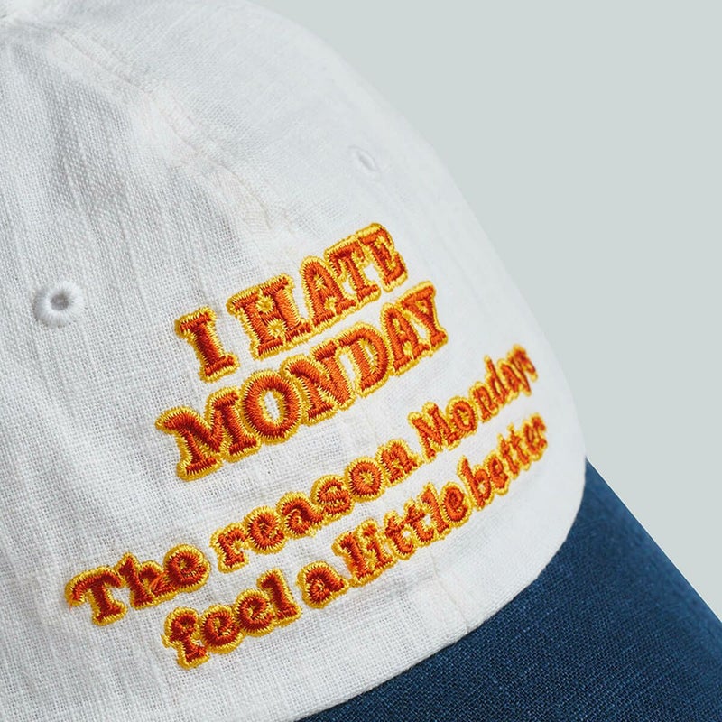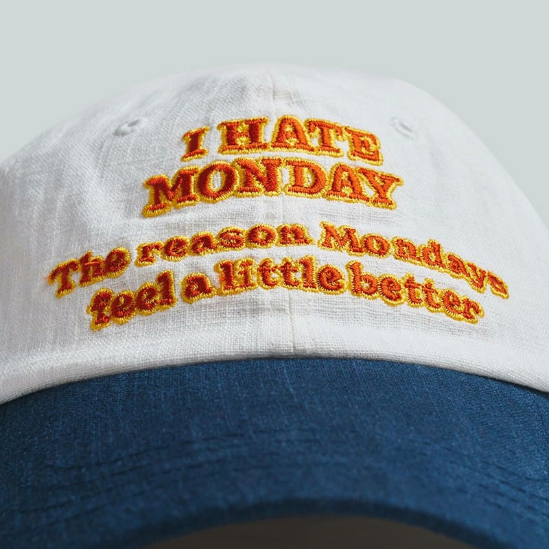 「I HATE MONODAY」の刺繍が入ったボールキャップ。このキャップをかぶれば、少しだけ月曜日が楽しくなるかもしれません。柔らかなフィット感とリアストラップで、どなたでも楽しく自然に着用いただけます。