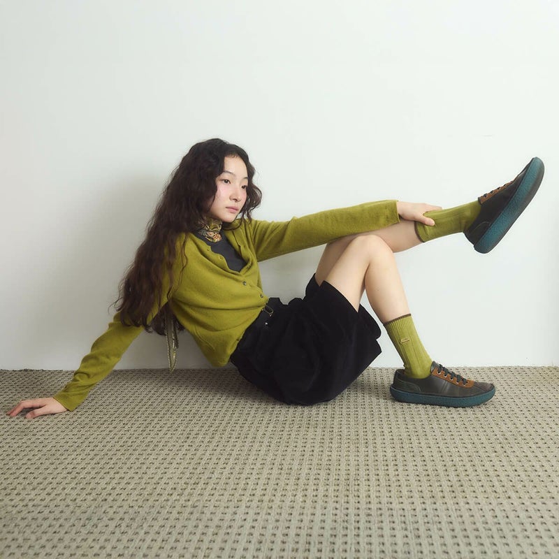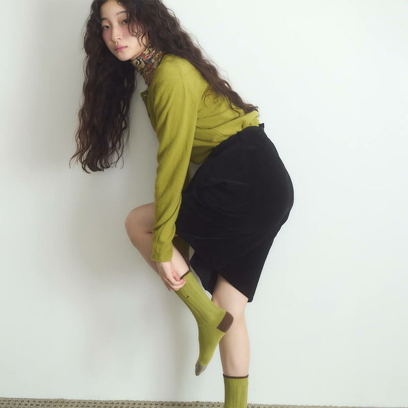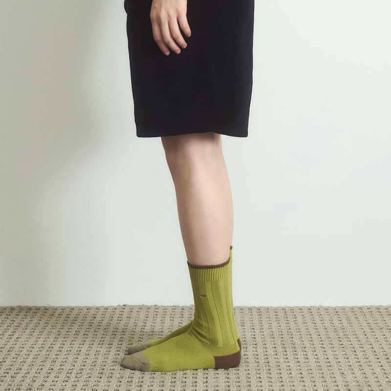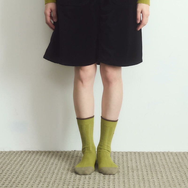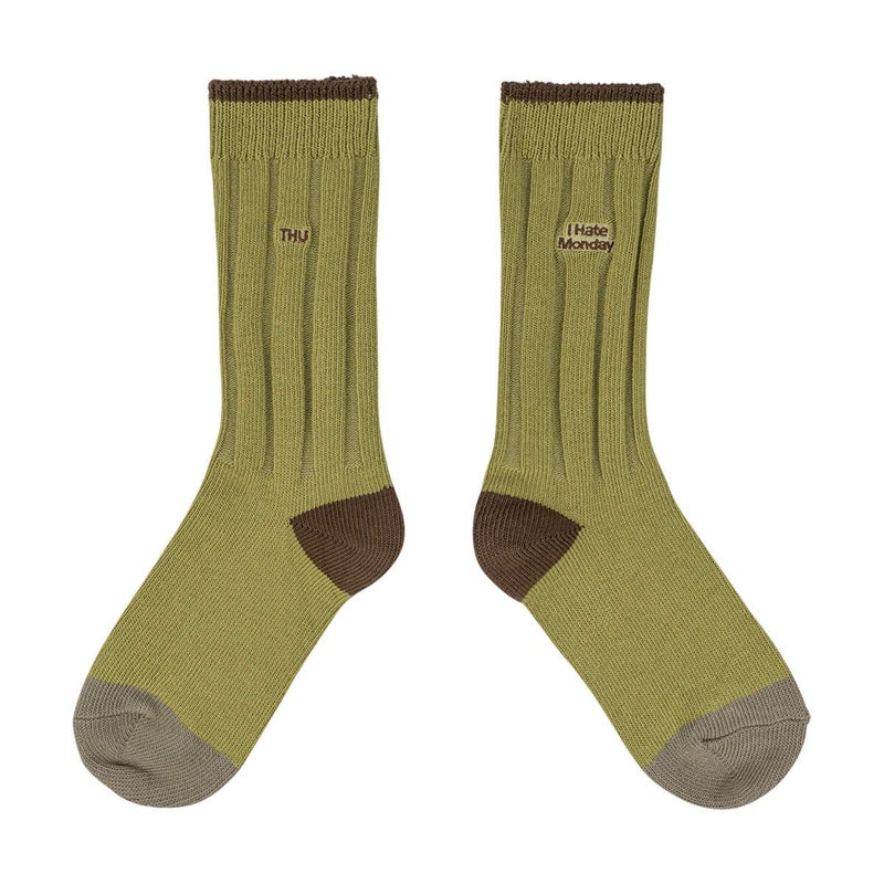 片方には曜日、もう片方には「I HATE MONDAY」の文字が、それぞれ異なるカラーの刺繍で施されています。高級コーマ糸を使用しており、快適で心地よい履き心地を実現しました。ヴィンテージ感のある秋カラーで、デイリースタイリングにも最適です。
