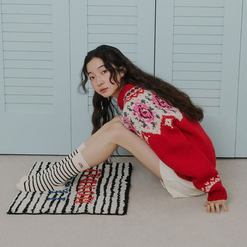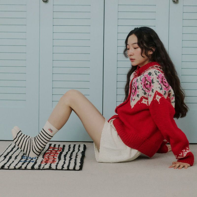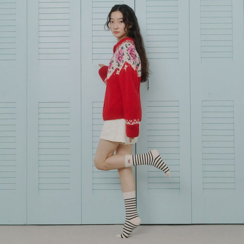 あたたかな素材で作られたストライプソックス。ブランドロゴがアクセントになっています。