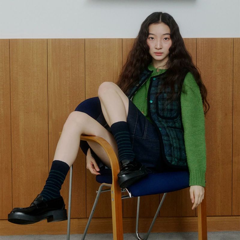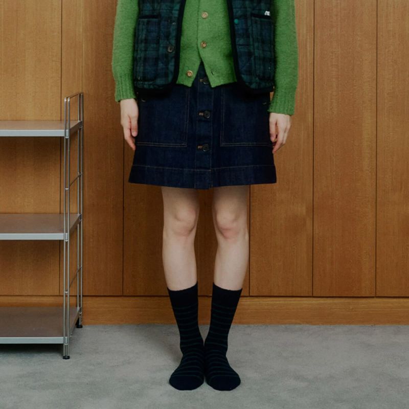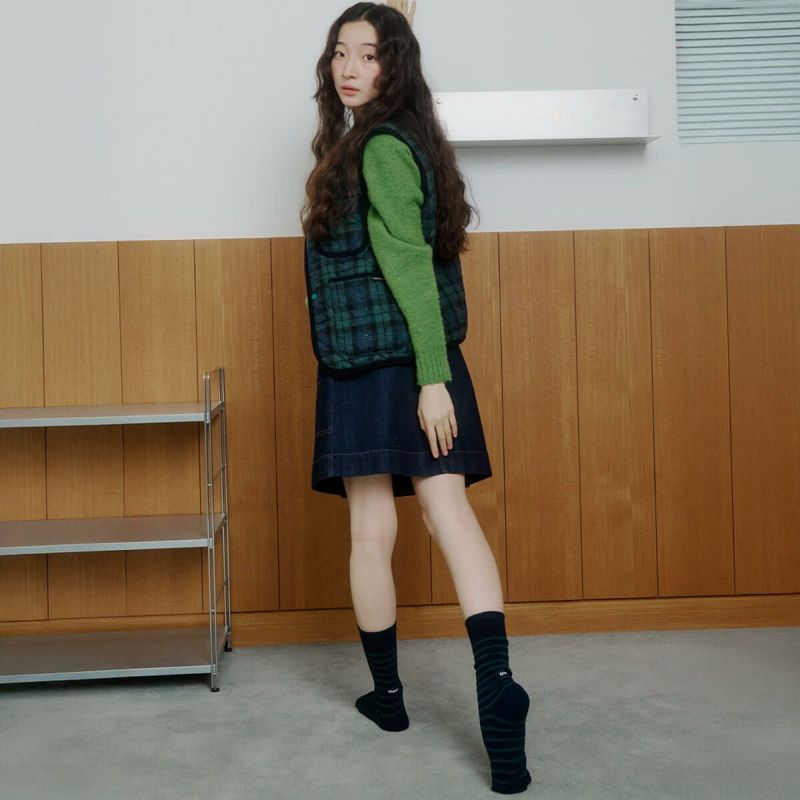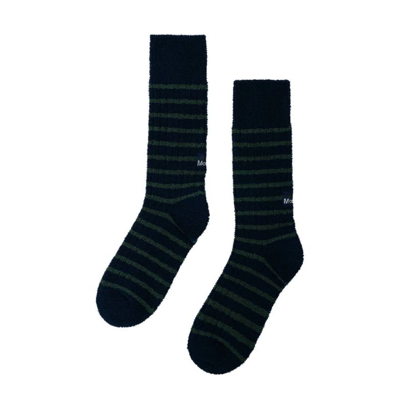 あたたかな素材で作られたストライプソックス。ブランドロゴがアクセントになっています。