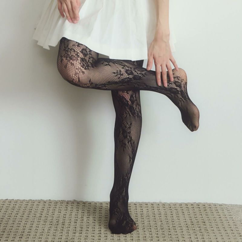 高品質なウレタンナイロンを使用しており、伸縮性に優れています。クラシックなレースパターンで、高級感と女性らしさを演出するレースストッキングです。