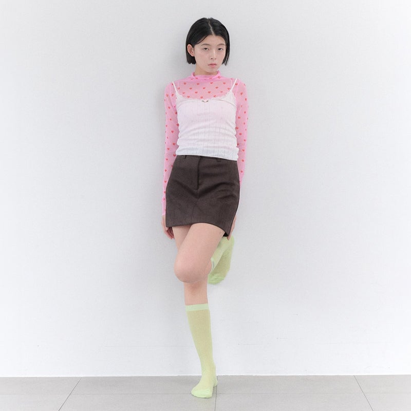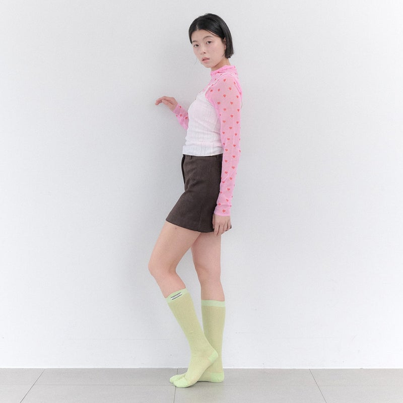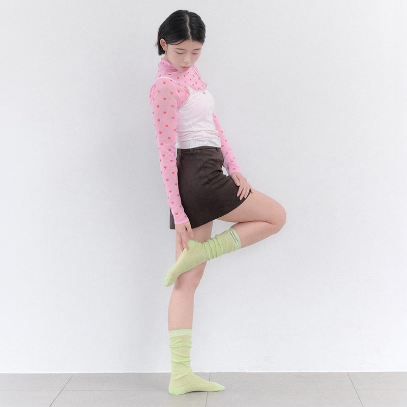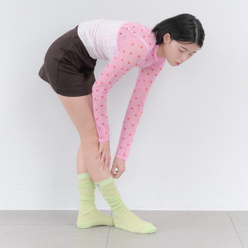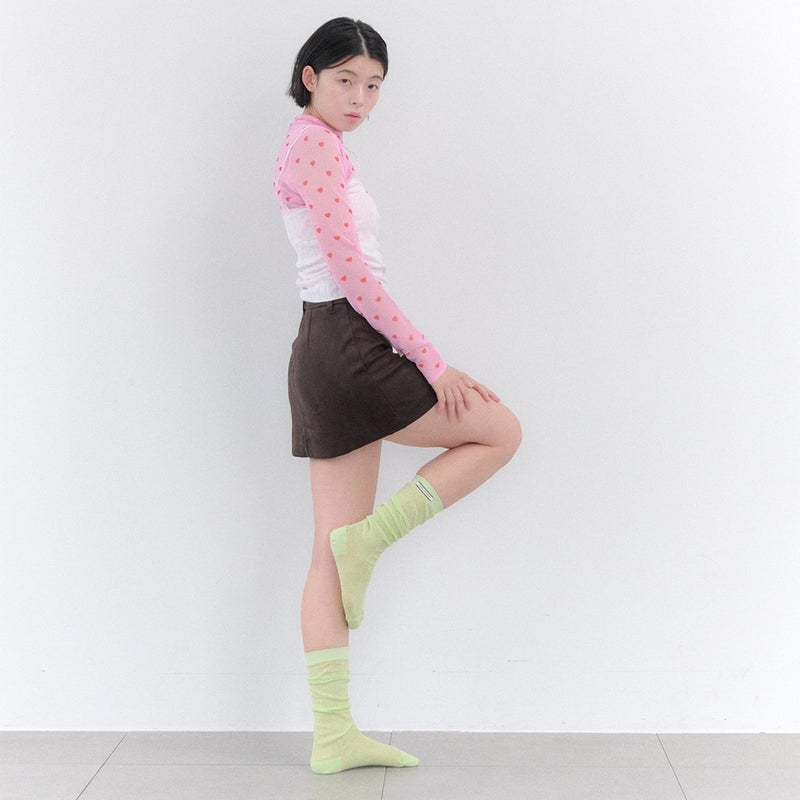 ゆったりとしたひざ下丈の薄手ソックス。クシュっと縮めても、伸ばして履いても可愛くアレンジできます。リブ部分のロゴタグがさりげないアクセントに。全5色展開。