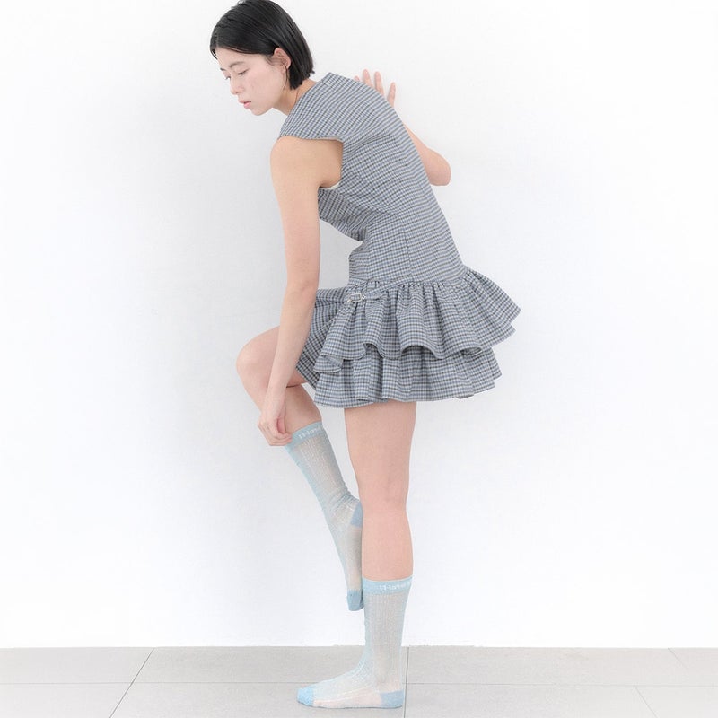 ラメがきらめくシアー素材のニーハイソックス。薄手で軽やかな履き心地に、リブ部分の「I Hate Monday」がさりげないアクセントをプラス。足元を華やかに演出してくれる一足です。