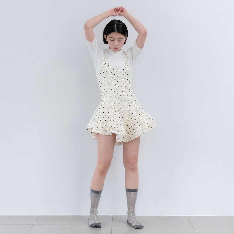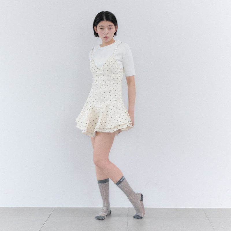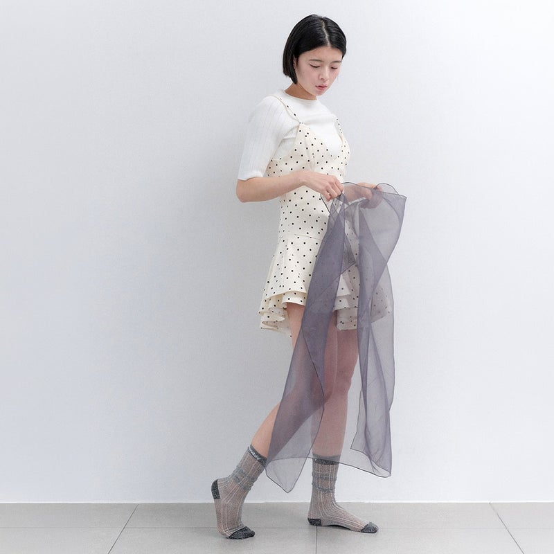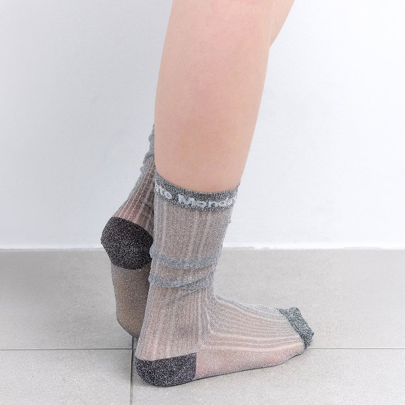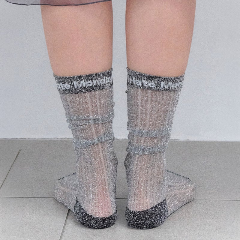 ラメがきらめくシアー素材のニーハイソックス。薄手で軽やかな履き心地に、リブ部分の「I Hate Monday」がさりげないアクセントをプラス。足元を華やかに演出してくれる一足です。