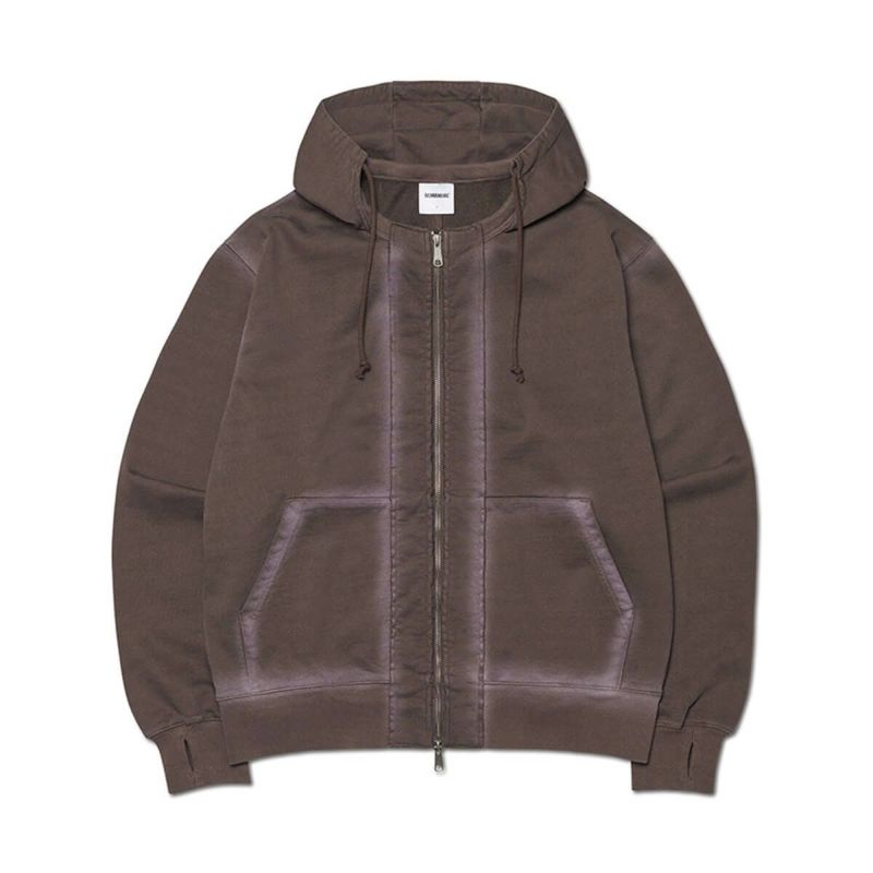 現代のフーディーの原型とされる「アフターフーディー」をモチーフに、ジップアップ仕様として再構築したデザイン。 初期のフーディー同様、ネックラインのリブとボディの間にフードを挟み込む構造を忠実に再現。 フロントには断ち切り仕上げのパッチを重ね、全体にウォッシング加工を施すことでヴィンテージな雰囲気を表現しました。 袖口にはフィンガーホールディテールを加え、安定感のある着用感を実現。 2WAYジッパー仕様
