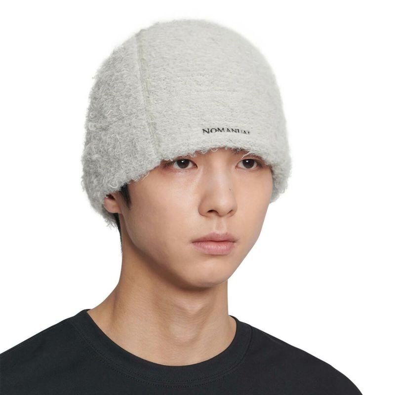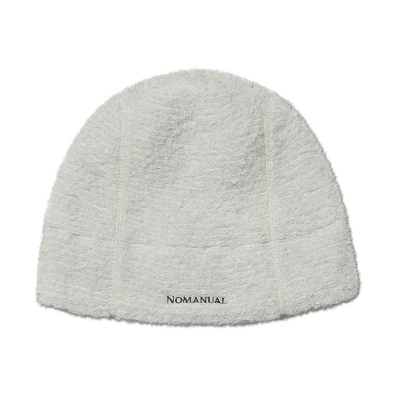 2色の糸を撚り合わせることで、ユニークなカラーと豊かなボリューム感を表現。 中央にはNOMANUALのテキストロゴをあしらい、デザインのアクセントを加えました。