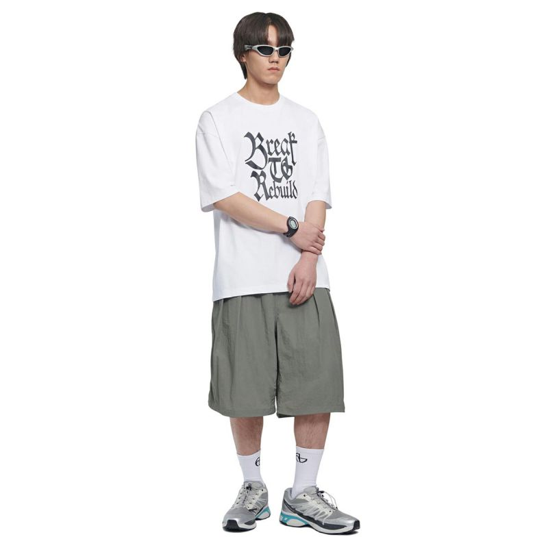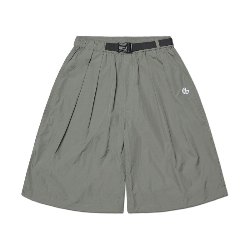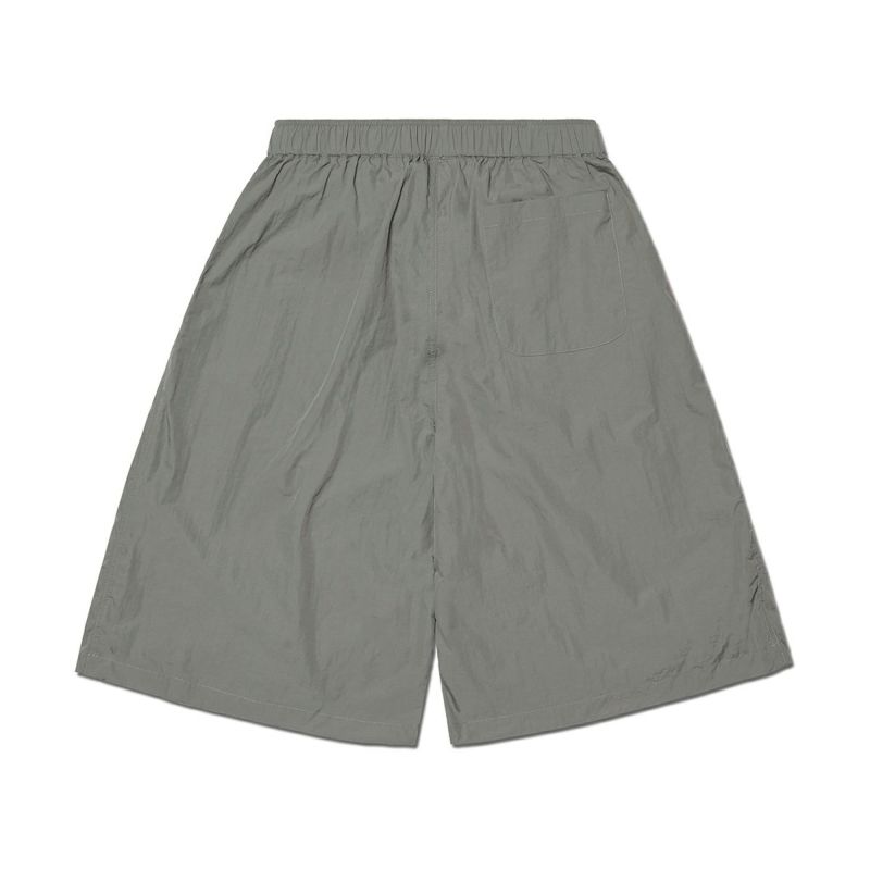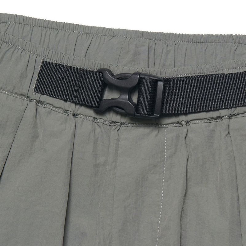 SHADE は「日陰」という意味です。真夏でも着用できるよう、薄手のナイロン生地で作られたパンツです。薄手のショーツ特有の不安定なフィット感を補うため、裾にドローストリングのディテールを追加しています。ドローストリングを絞ることで、パンプキンパンツ風のシルエットにも調整可能です。ウエストは開閉可能なバックルストラップ付きで、より着脱しやすくなっています。