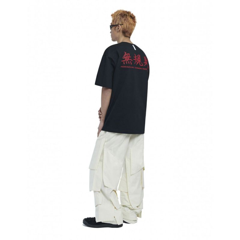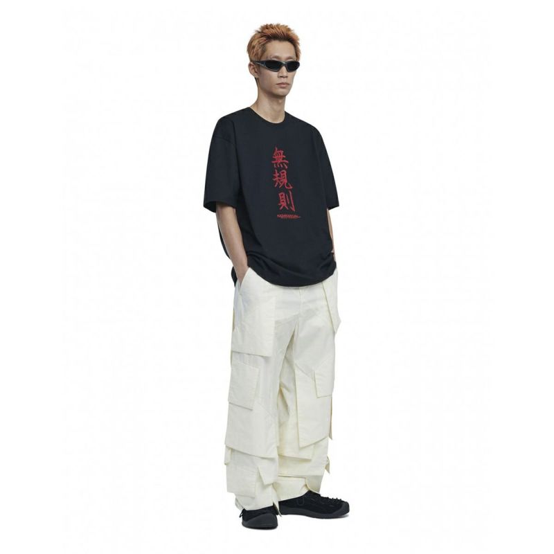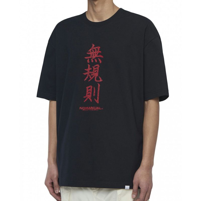 前後に大胆に配置された漢字「無規則」のプリントが、強い存在感とメッセージ性を放つグラフィックTシャツ。 “ルールや型にとらわれない自由な発想” を表現したこの一着は、シンプルなコーディネートの中でも異彩を放つ、個性派にぴったりのアイテムです。 ピグメント染めとウォッシュ加工による風合いのある仕上がりが、グラフィックの力強さと相まって、唯一無二の空気感を演出します。 32番手の細い糸を2本撚り合わせて作られた生地で、高密度かつ高い耐久性が特長です。酵素を用いた加工で、生地表面の短い繊維を取り除き、滑らかで