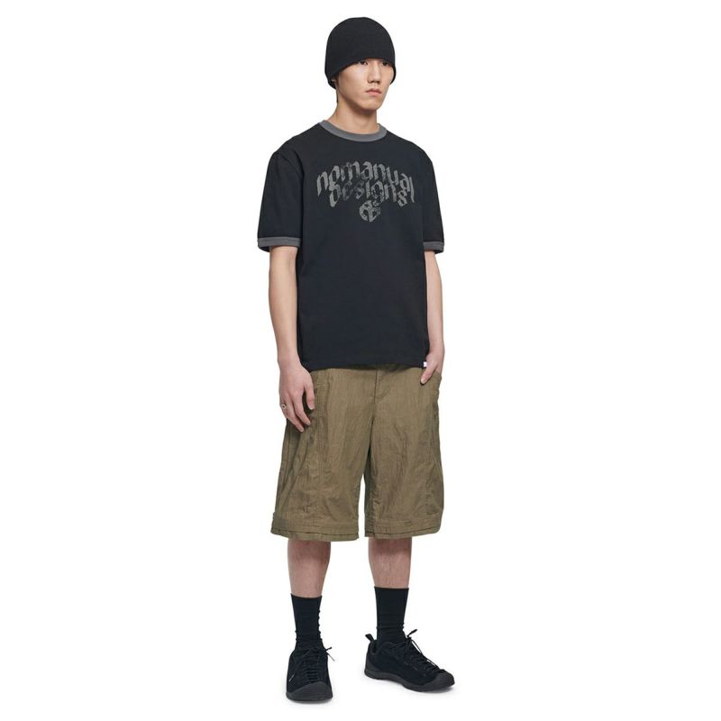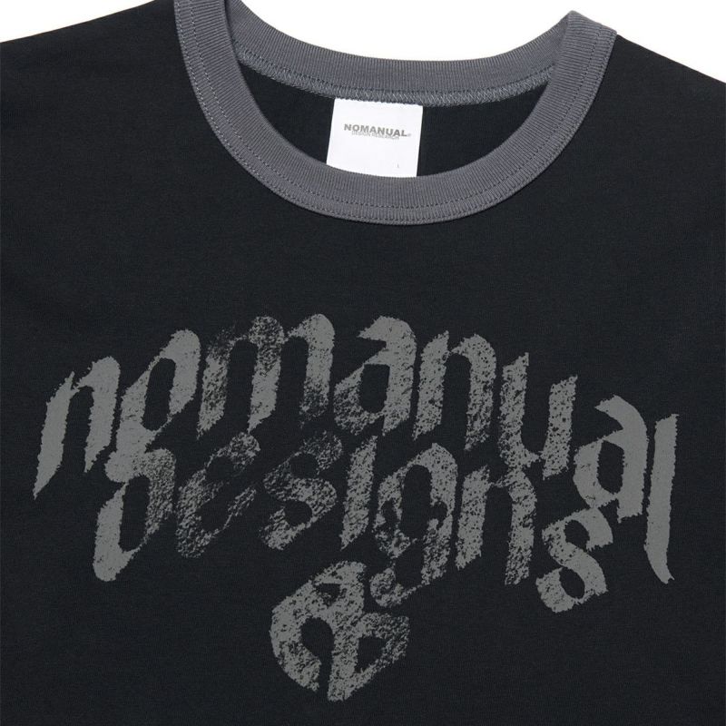 "NOMANUAL DESIGN" の略語をモチーフにしたデザイン。 ネックラインと袖口のリブ部分に配色されたリンガーTシャツ。 32番手の細い糸を2本撚り合わせて作られた生地で、高密度かつ高い耐久性が特長です。酵素を用いた加工で、生地表面の短い繊維を取り除き、滑らかで涼しげな質感に仕上げています。縫製前に生地を水に浸してあらかじめ縮ませる加工で、洗濯後の型崩れや縮みを防止する効果があります。