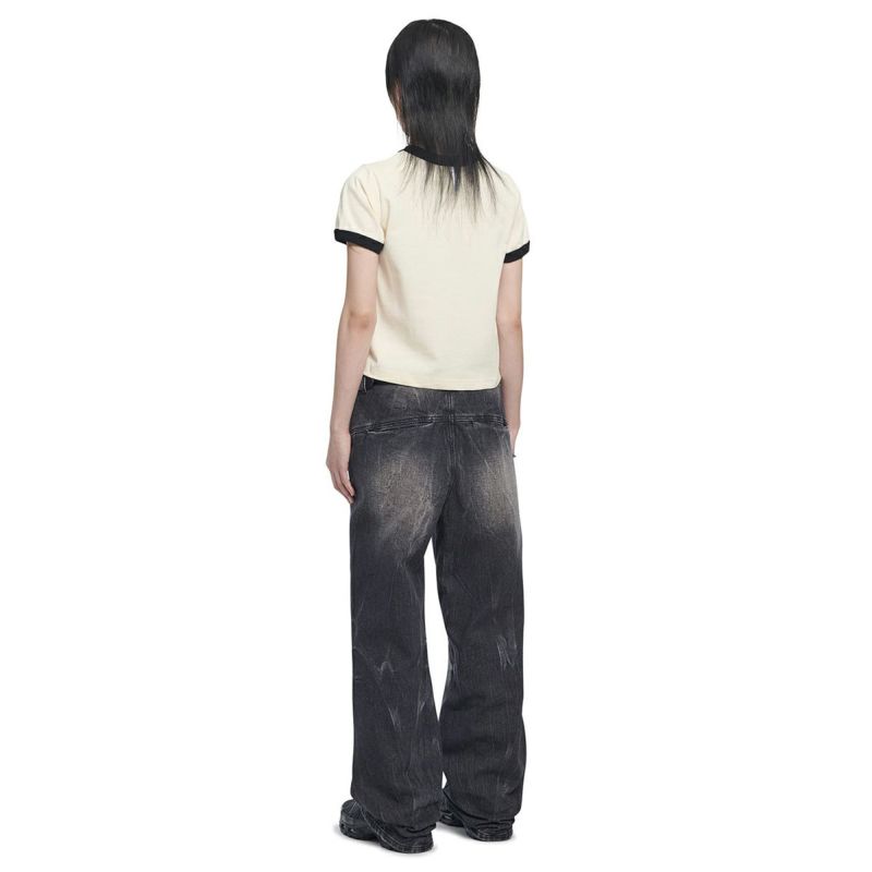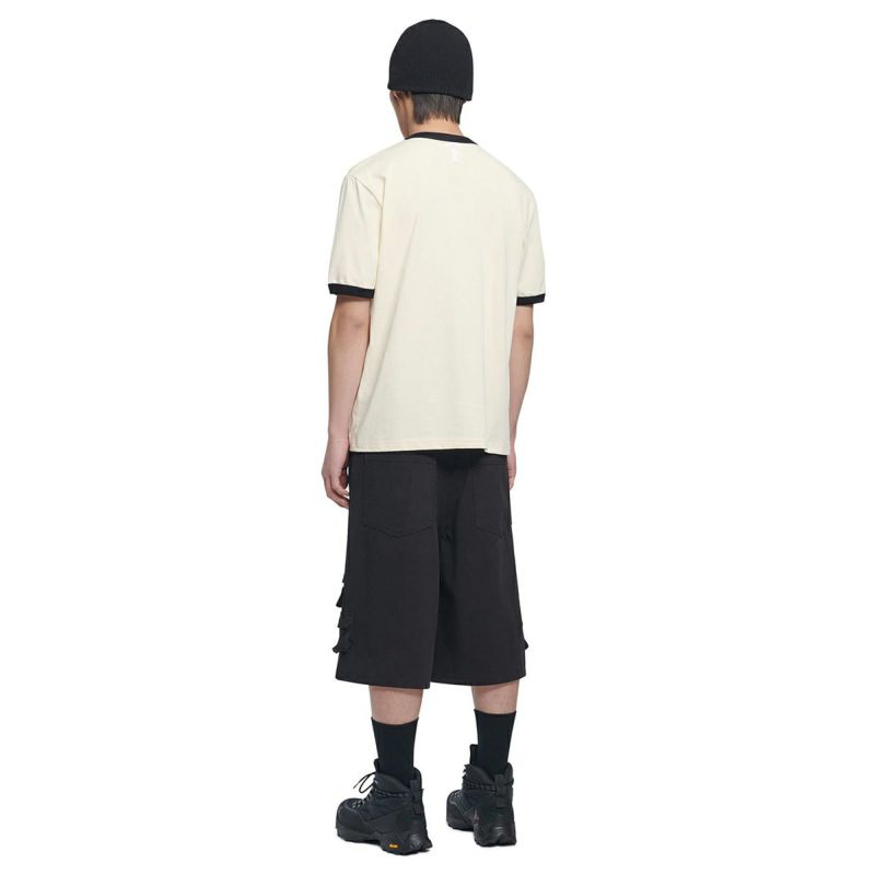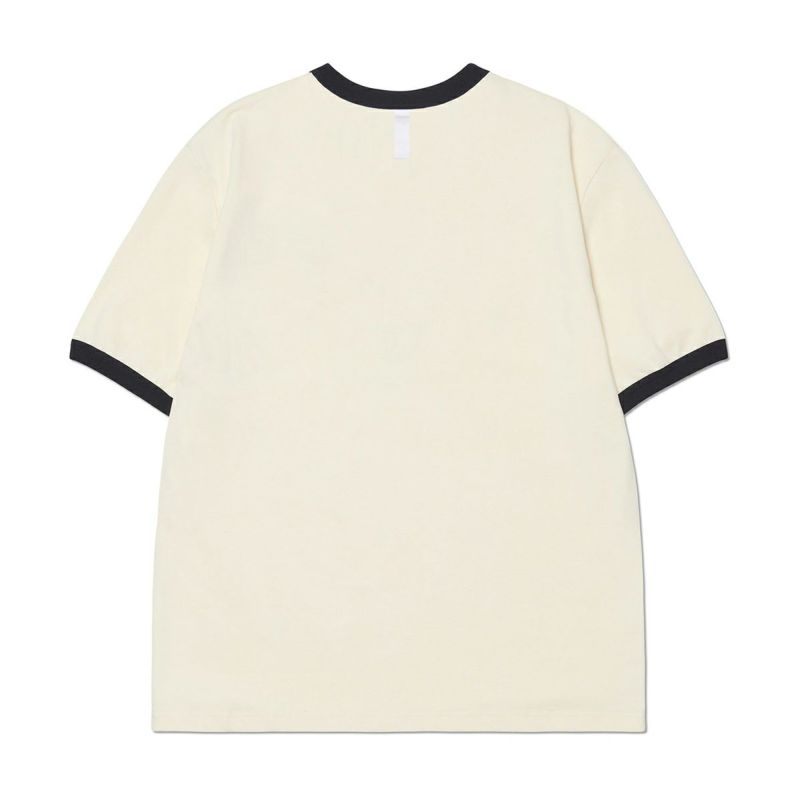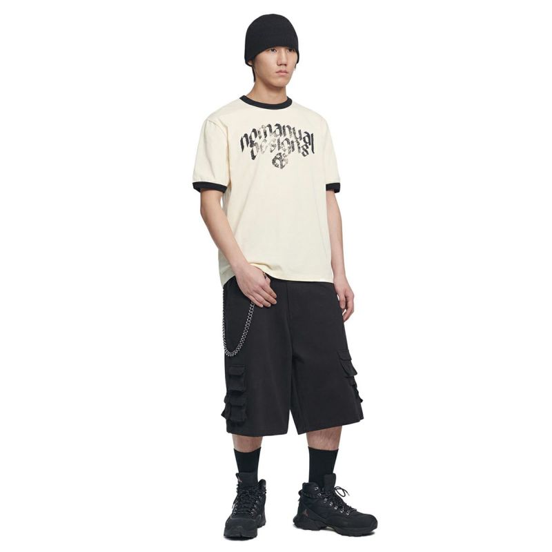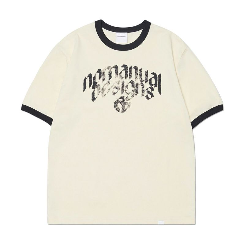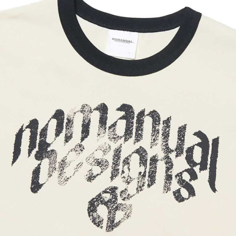"NOMANUAL DESIGN" の略語をモチーフにしたデザイン。 ネックラインと袖口のリブ部分に配色されたリンガーTシャツ。 32番手の細い糸を2本撚り合わせて作られた生地で、高密度かつ高い耐久性が特長です。酵素を用いた加工で、生地表面の短い繊維を取り除き、滑らかで涼しげな質感に仕上げています。縫製前に生地を水に浸してあらかじめ縮ませる加工で、洗濯後の型崩れや縮みを防止する効果があります。