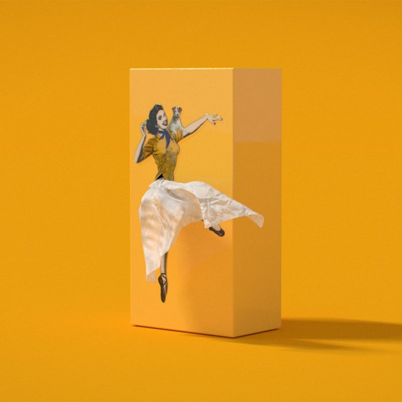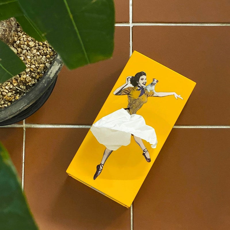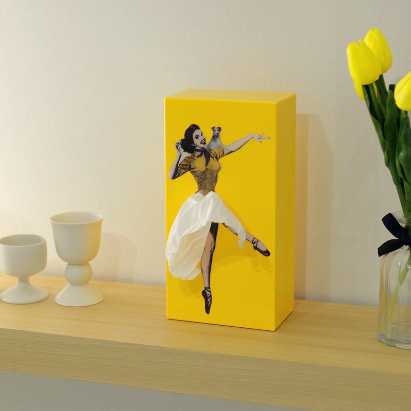 フラッパー・ティッシュは、普通のティッシュに女性のスカートがふわりと風になびくという要素を加え、箱からティッシュを取り出す度に女性のスカートを脱がせるような感覚を与えるユニークなテッシュケースです。