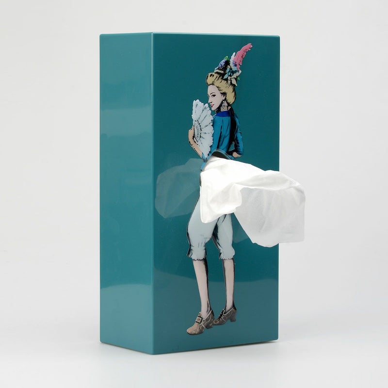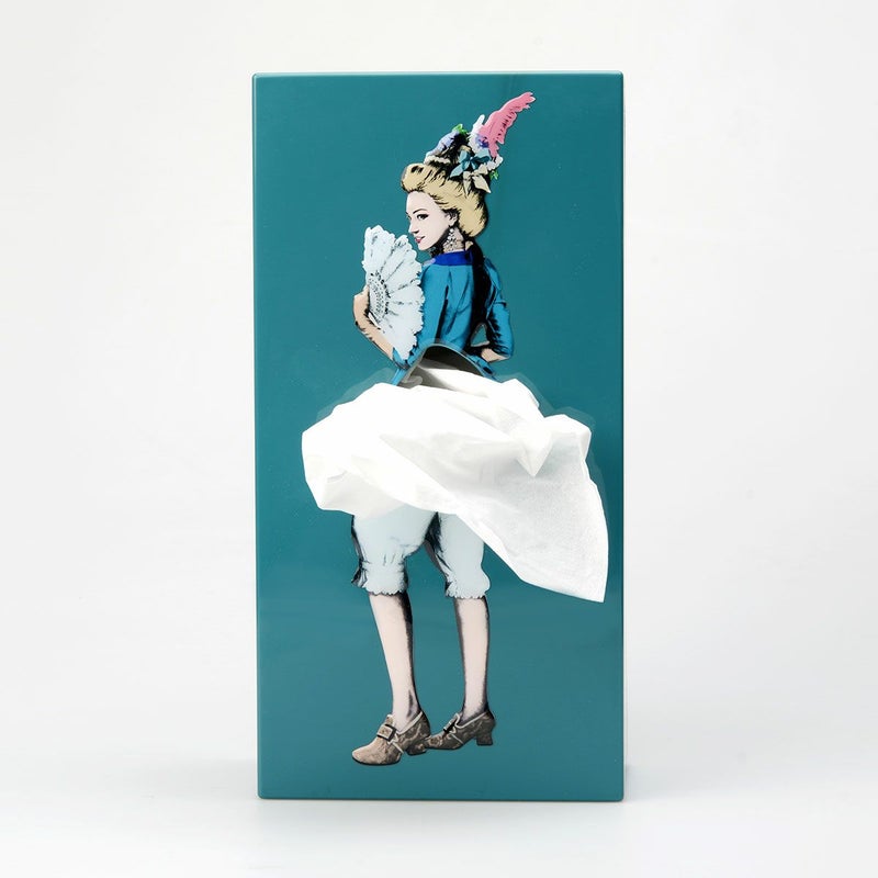 フラッパー・ティッシュは、普通のティッシュに女性のスカートがふわりと風になびくという要素を加え、箱からティッシュを取り出す度に女性のスカートを脱がせるような感覚を与えるユニークなテッシュケースです。