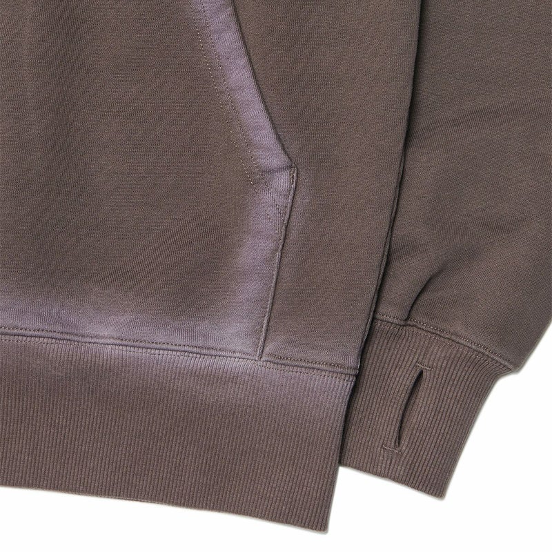 現代のフーディーの原型とされる「アフターフーディー」をモチーフに、ジップアップ仕様として再構築したデザイン。 初期のフーディー同様、ネックラインのリブとボディの間にフードを挟み込む構造を忠実に再現。 フロントには断ち切り仕上げのパッチを重ね、全体にウォッシング加工を施すことでヴィンテージな雰囲気を表現しました。 袖口にはフィンガーホールディテールを加え、安定感のある着用感を実現。 2WAYジッパー仕様