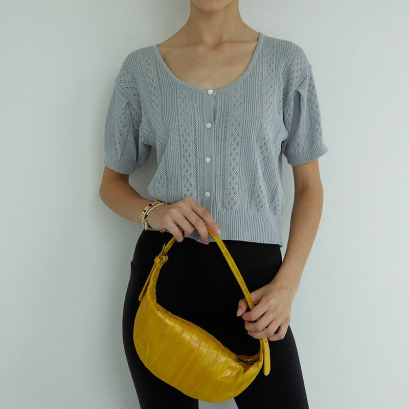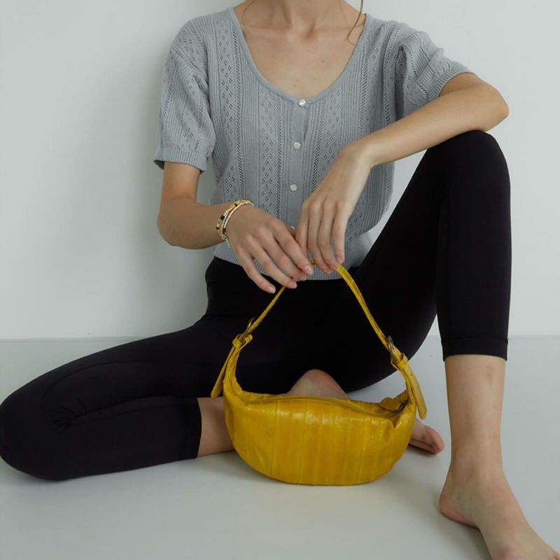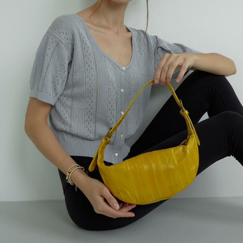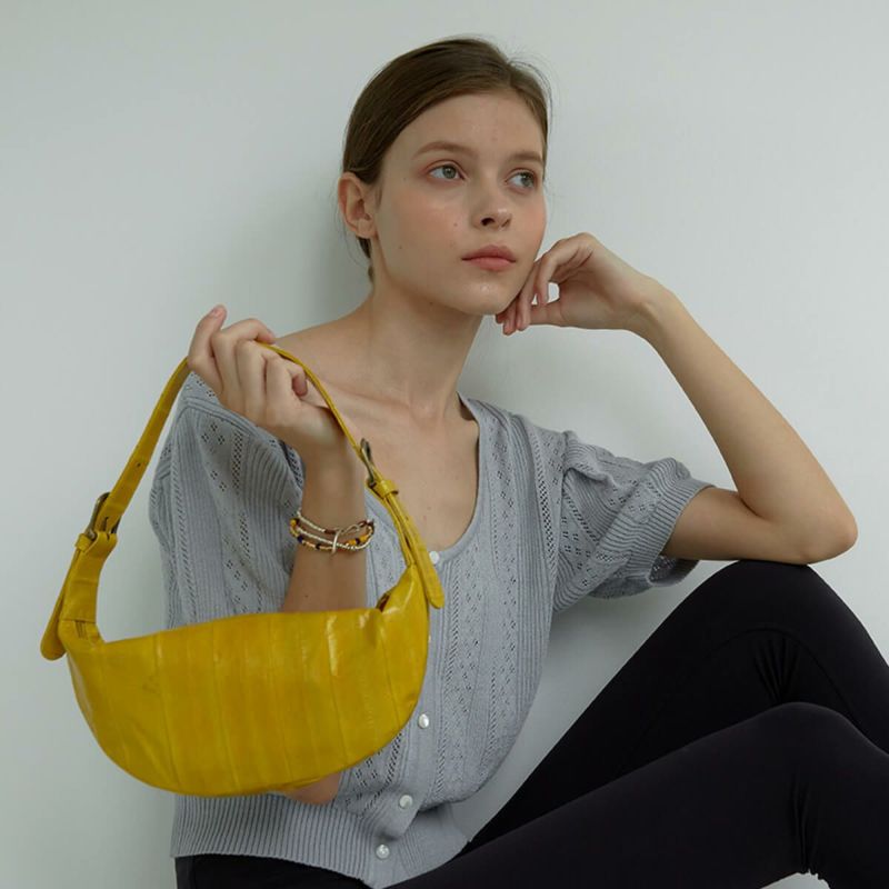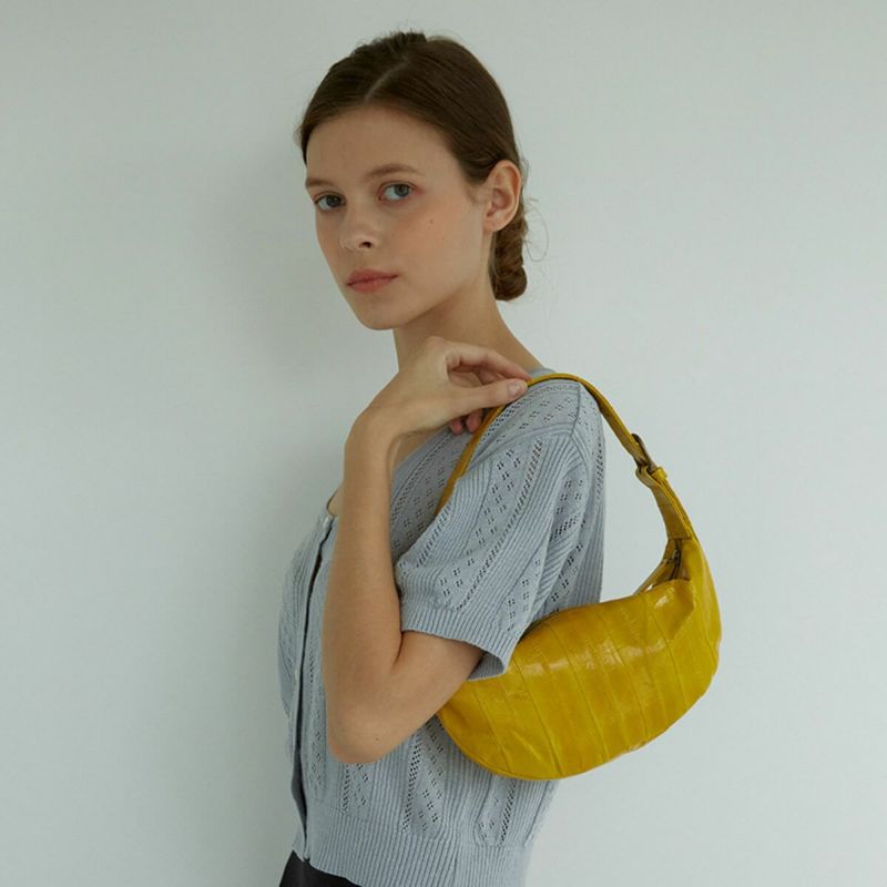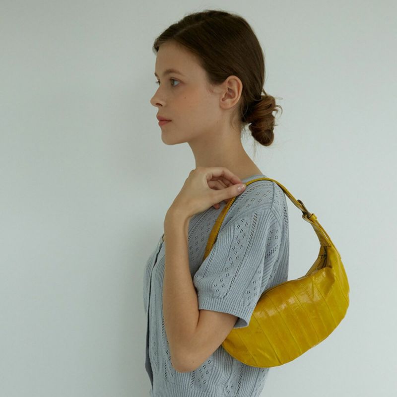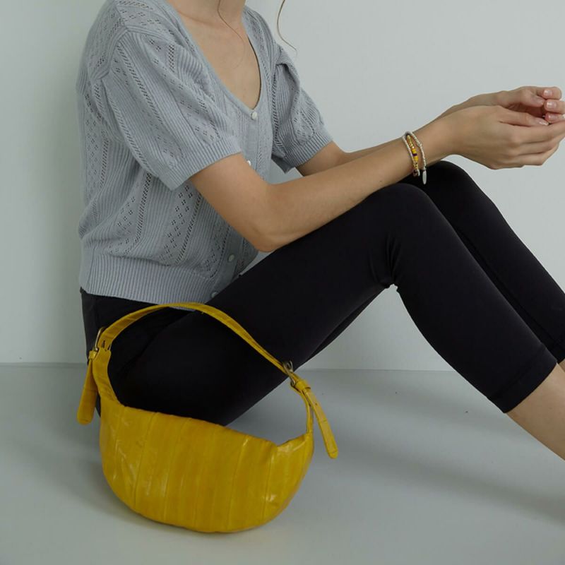クロワッサンのような可愛いシェイプがポイントのバッグです。