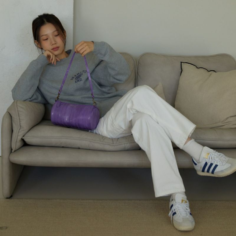 円筒形が可愛いショルダーバッグ。側面中央のメタルプレートロゴがポイントです。