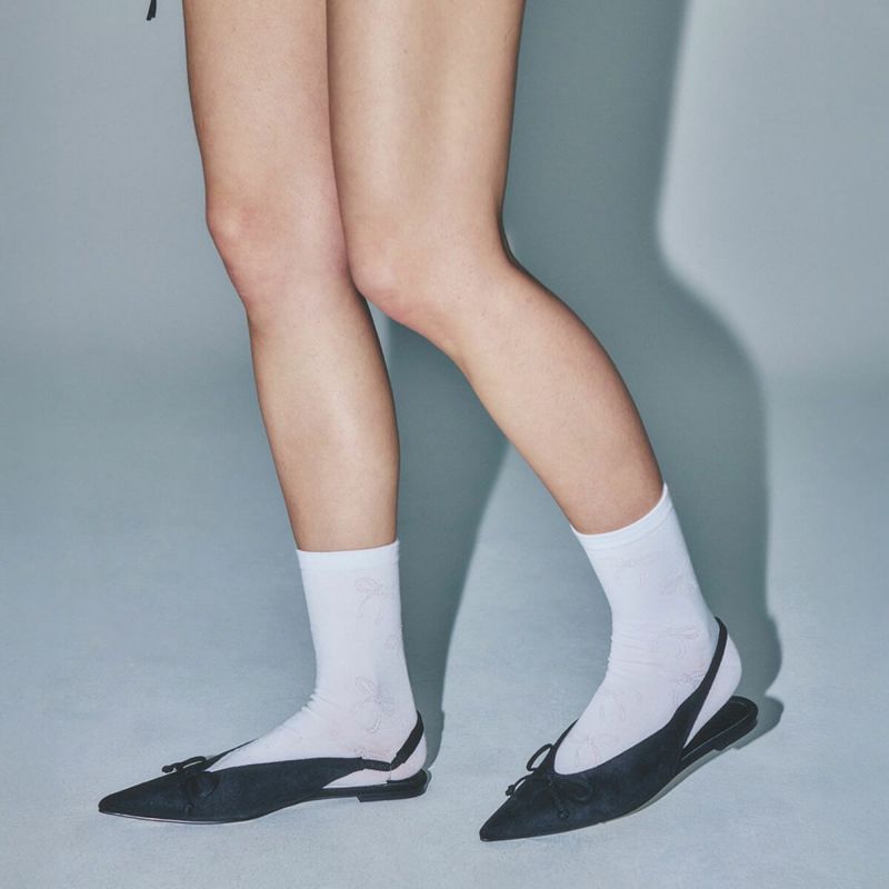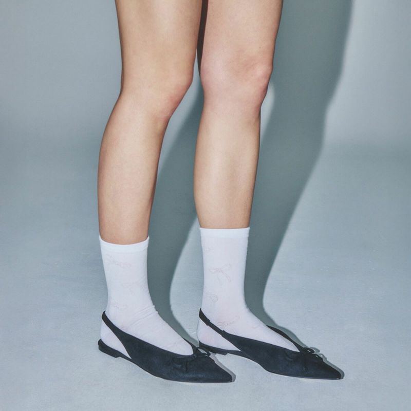 控えめに光るリボンパターンがポイントのソックスです。柔らかくて丈夫な高級コーマ糸で作られ、可愛すぎないディテールが日常的に使えるソックスです。