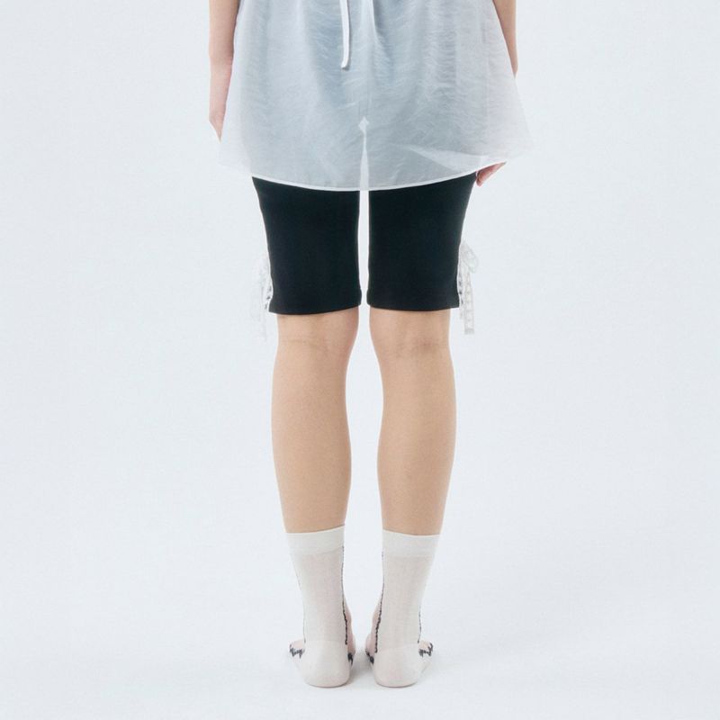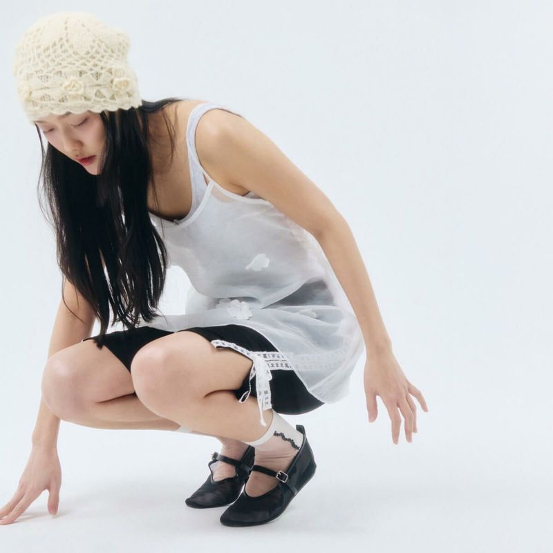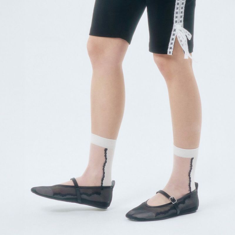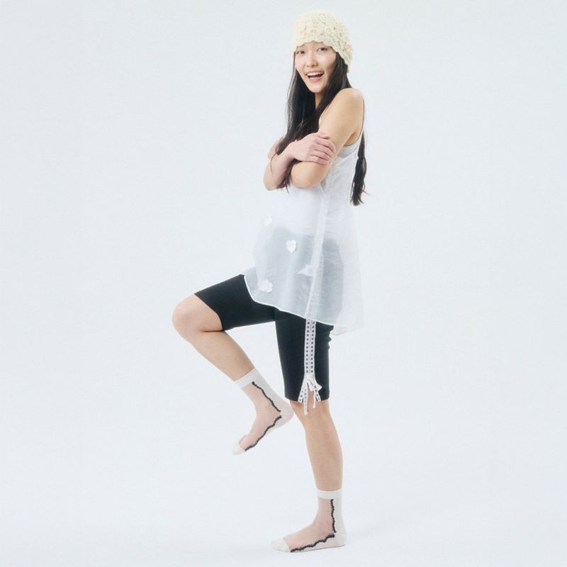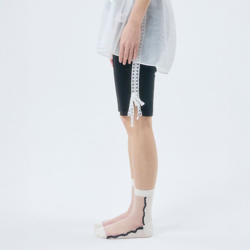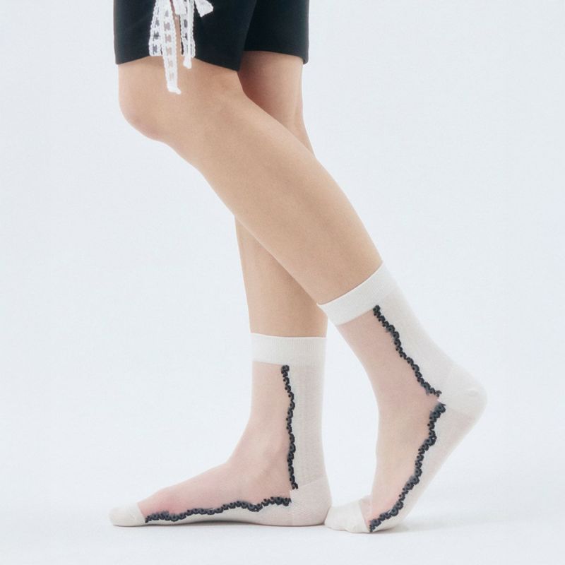 控えめに透け感のあるシースルー素材に、曲線的なレースディテールが加わり、愛らしくユニークなムードを演出するソックスです。控えめなカラーとデザインなので、さまざまなシューズと合わせやすく、足裏部分は高級コーマ糸で柔らかな履き心地を提供します。