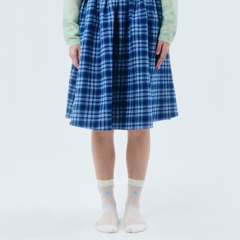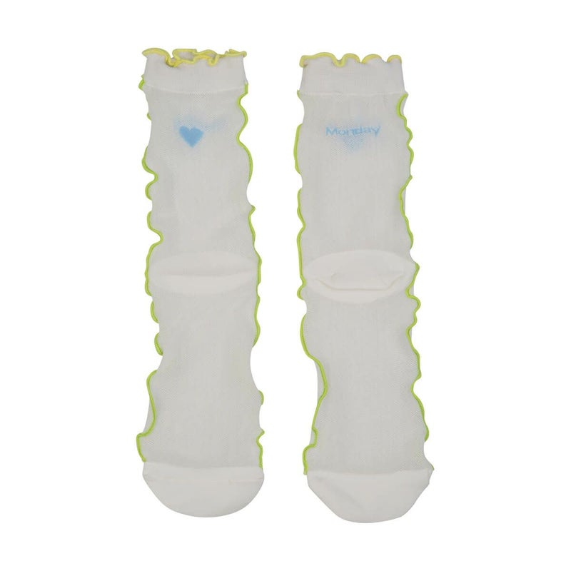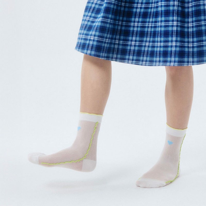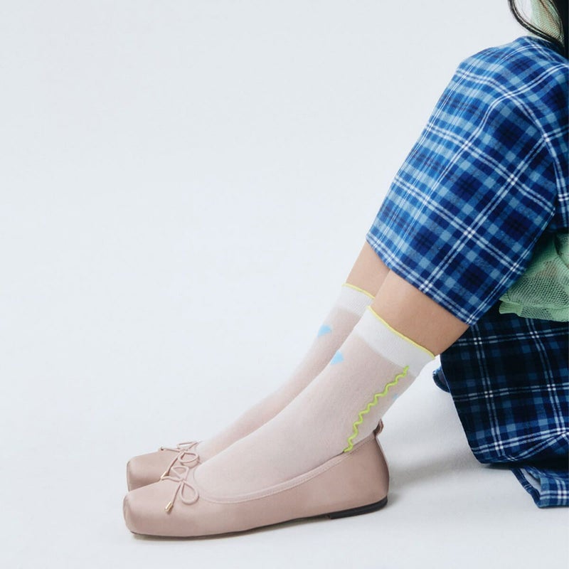 左右異なるパターンと愛らしい波形ディテールがポイントのシースルーソックスです。通気性の良い薄い素材で、夏でも涼しく着用でき、柔らかなカラーと可愛らしいデザインでデイリーコーデにぴったりなアクセントになります。