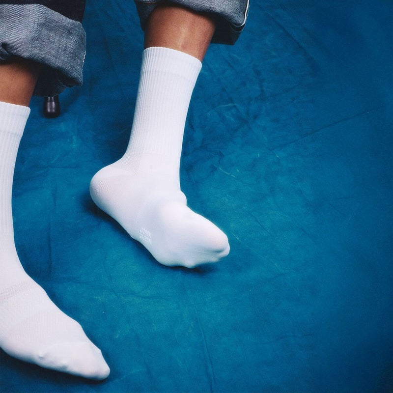 高機能素材「ドライクール」の使用により、汗をすばやく吸収・速乾し、足元をドライで清潔に保ちます。通気性に優れた足の甲と、かかと部分のメッシュ構造が熱を素早く外へ逃がし、ムレを防いで一日中快適な状態をキープします。また、足の甲をしっかりホールドするリブ編み構造が、着地時のブレを抑えてケガを予防し、テーピングのように安定感を与えてくれます。足裏には滑り止め加工が施されており、ソックスのズレや滑りを防止して安定したフィット感を実現します。