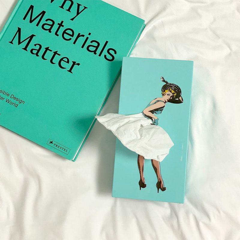 フラッパー・ティッシュは、普通のティッシュに女性のスカートがふわりと風になびくという要素を加え、箱からティッシュを取り出す度に女性のスカートを脱がせるような感覚を与えるユニークなテッシュケースです。