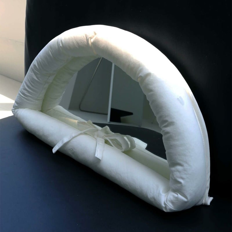 クッションミラーは特別なお手入れの必要はありませんが、埃が気になる際はコロコロで軽くひと拭きしていただくだけで、美しさを保つことができます。また、鏡のファブリックフレームは鏡本体と分離ができますので、洗濯をご希望の際は、最も安全なドライクリーニングをお勧めします。