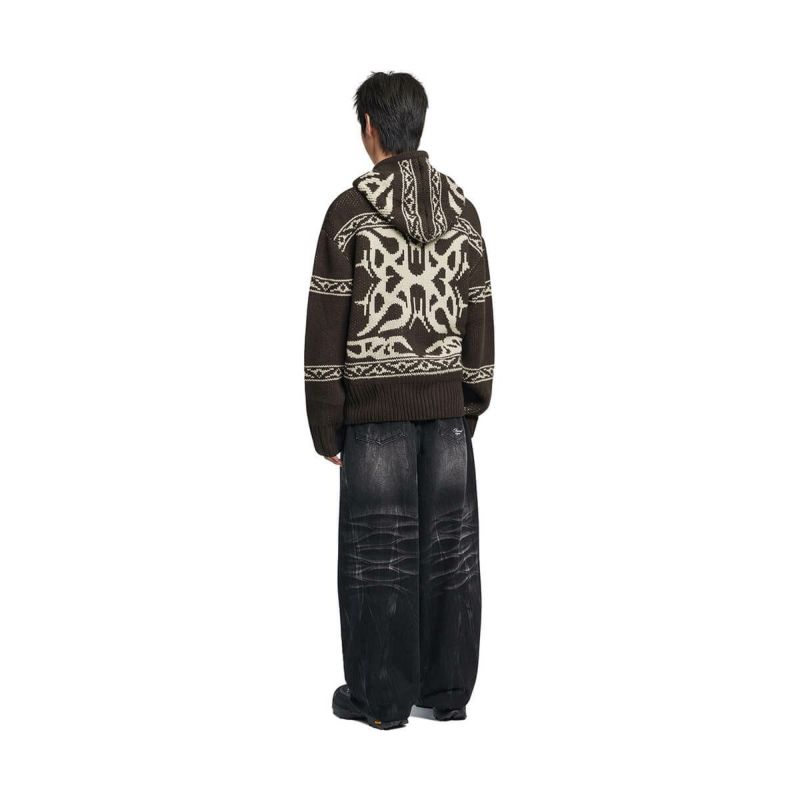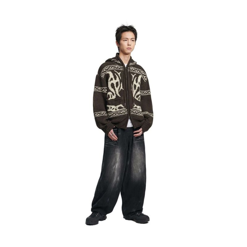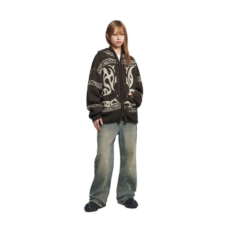 カウチンのムードをNOMANUALらしい感性で再解釈したニットジップアップ。 伝統的なカウチンニットのパターンを、NOMANUAL特有のグラフィックで織り上げ、モダンにアレンジ。 一般的なカウチンニットとは異なり、フードを加えることでよりデイリーでリラックス感のあるシルエットを演出しました。 24FWシーズンに向け、実用性を考慮してポケットディテールを追加。 2WAYジッパー仕様